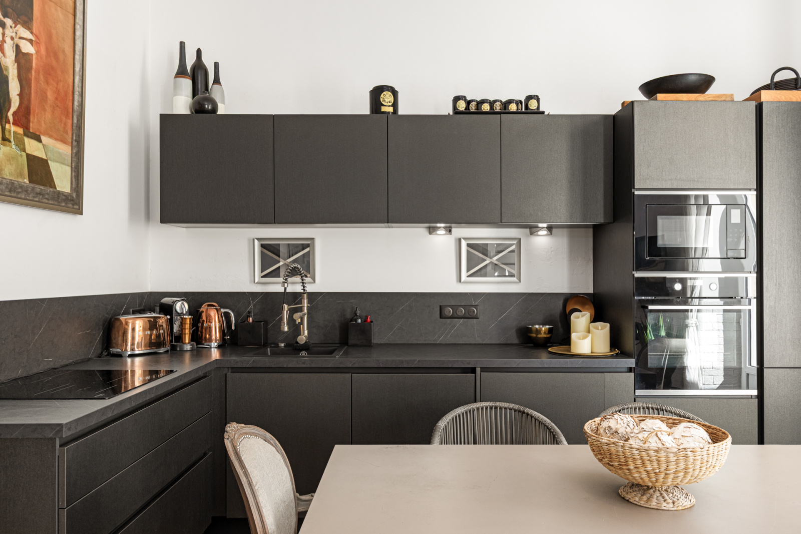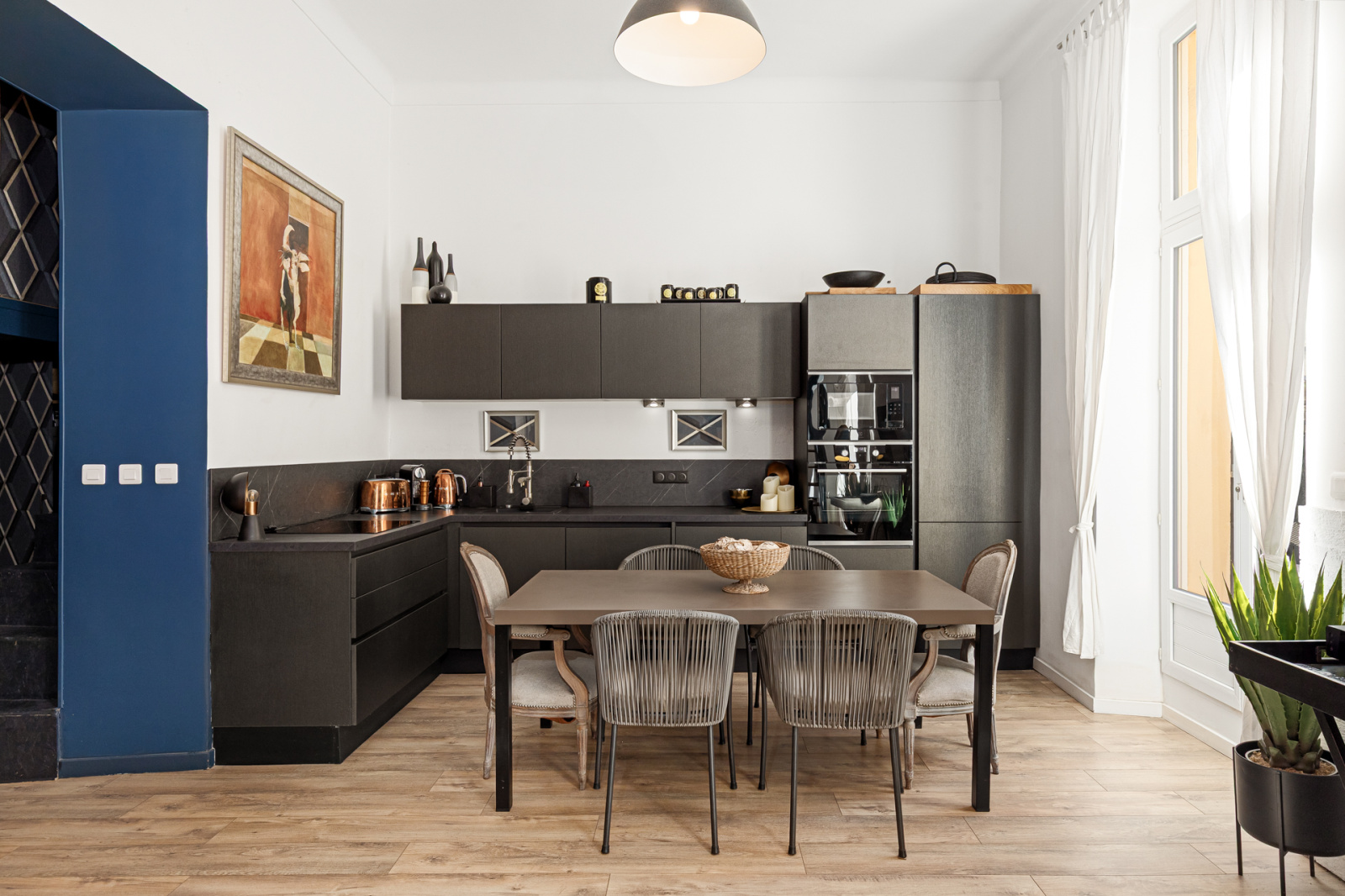 La cuisine américaine, entièrement aménagée et équipée, s’ouvre sur un séjour lumineux et élégant, invitant à la convivialité et à la détente.